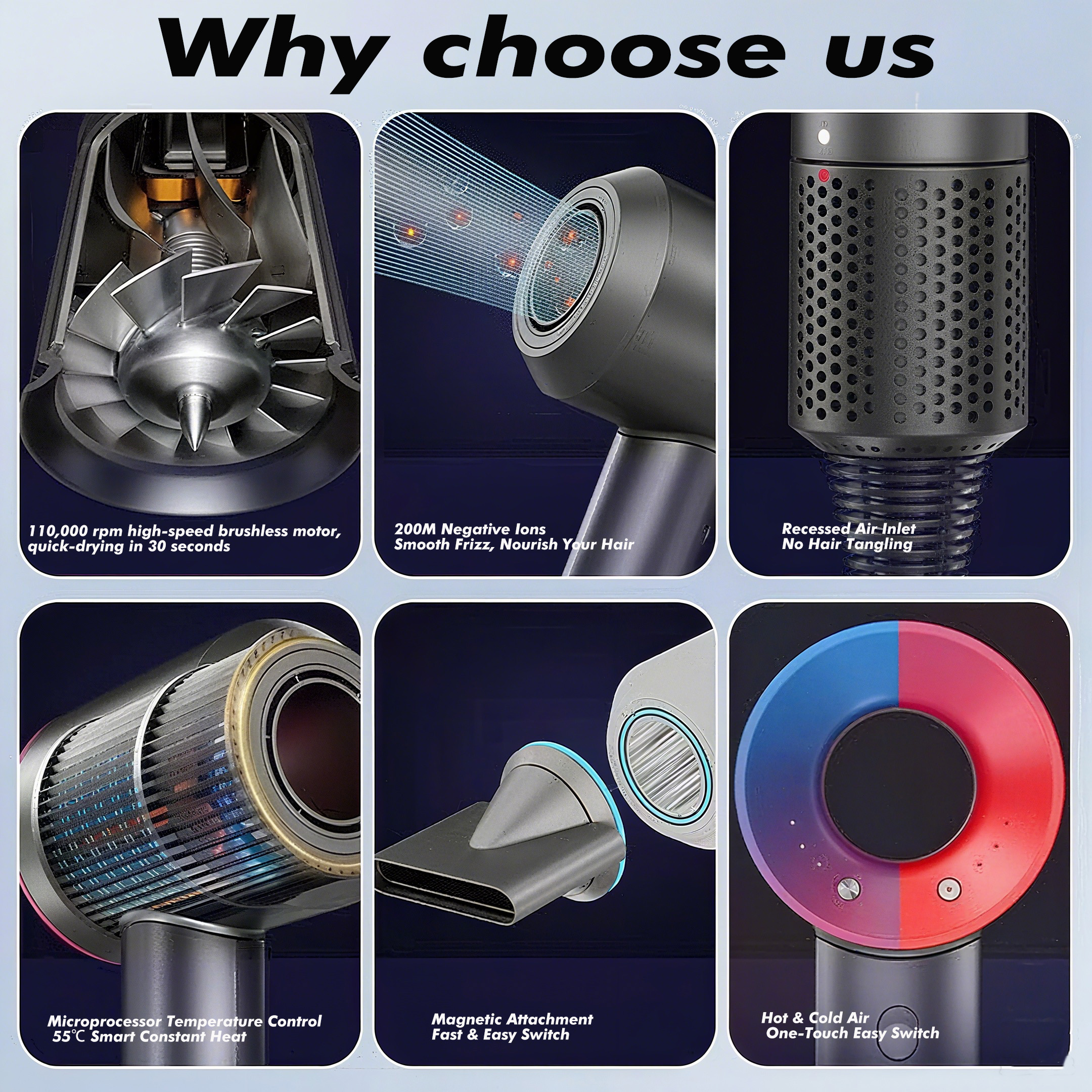 *Our high speed dryer is equipped with a 110000 RPM high-speed brushless motor and the wind speed up to 22 m/s with strong airflow which can dry your hair in a short time.We optimize the motor and air duct, sound is carefully modulated to reduce sharp noise and provide a pleasant hair drying experience.